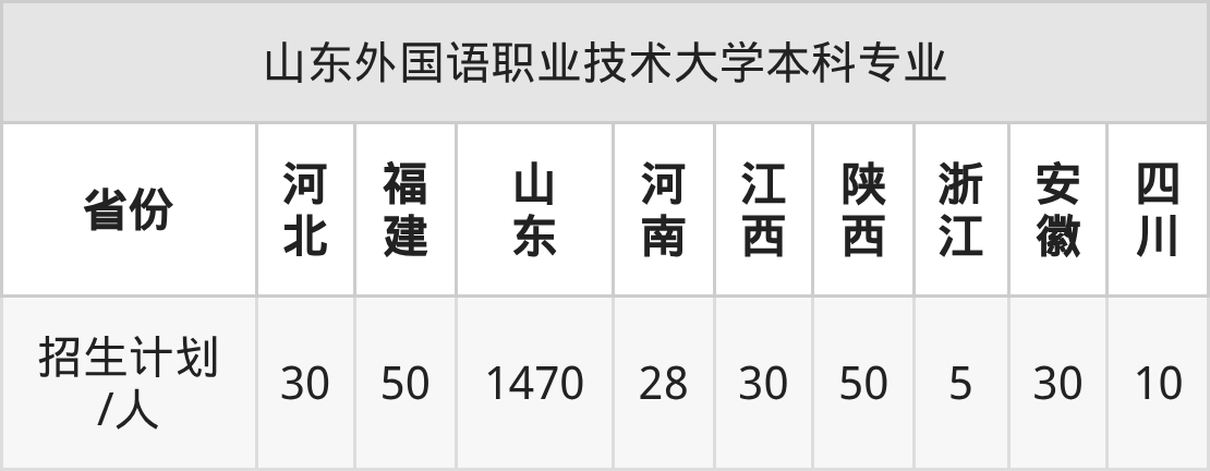 山东外国语职业技术大学面向四川(10人)、陕西(50人)、河北(30人)、山东(1470人)、江西(30人)、浙江(5人)、安徽(30人)等9个地区开展本科招生。其中其余省份为本科批。