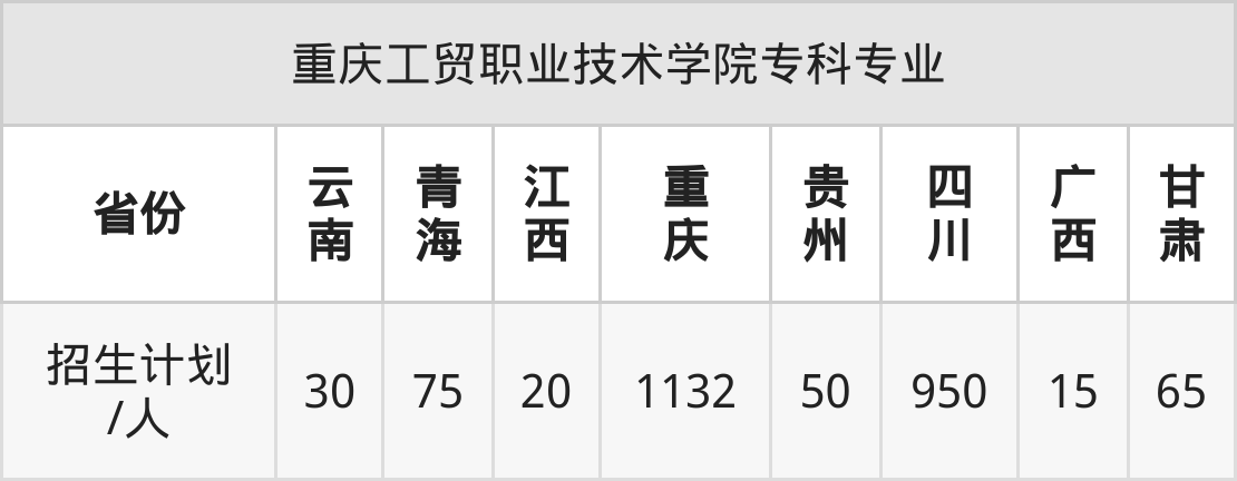 重庆工贸职业技术学院面向广西(15人)、甘肃(65人)、云南(30人)、青海(75人)、江西(20人)、重庆(1132人)、贵州(50人)等8个地区开展专科招生。招生批次为专科批。