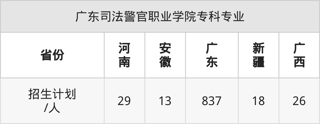 广东司法警官职业学院面向广西(26人)、河南(29人)、安徽(13人)、广东(837人)、新疆(18人)开展专科招生。招生批次为专科批。