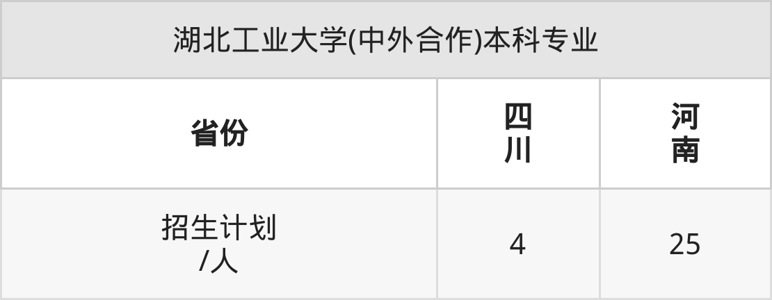 湖北工业大学(中外合作)面向河南(25人)、四川(4人)开展本科招生。招生批次为本科一批。
