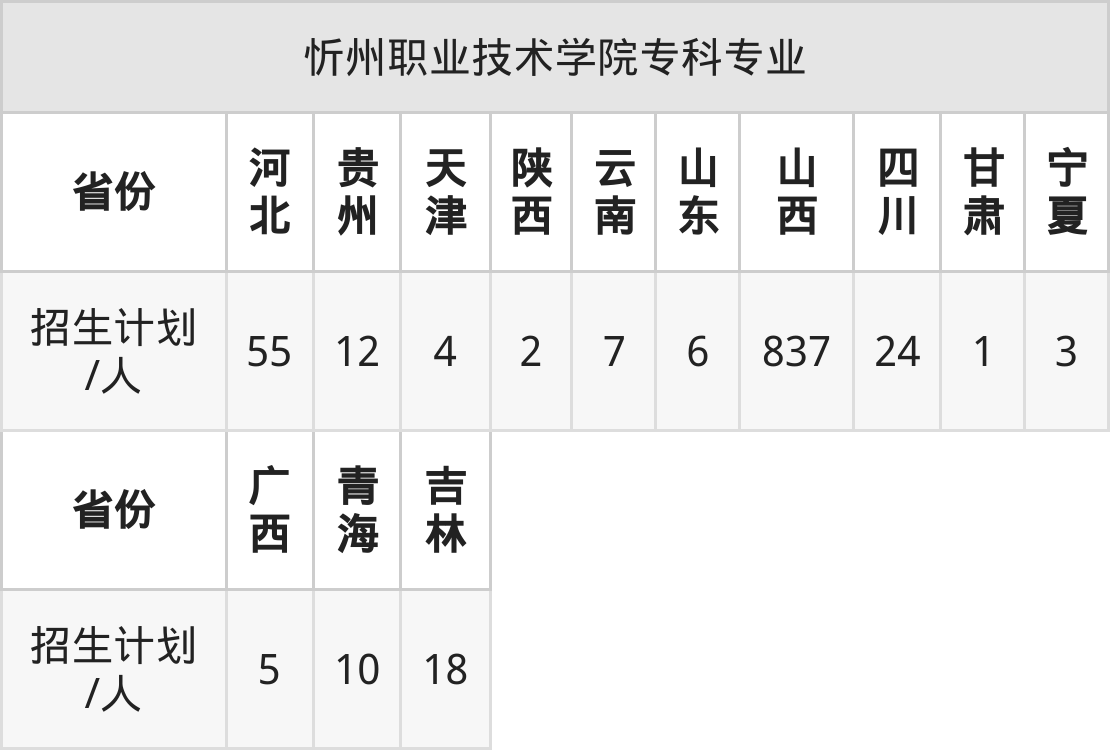 忻州职业技术学院面向天津(4人)、甘肃(1人)、广西(5人)、陕西(2人)、云南(7人)、青海(10人)、吉林(18人)等13个地区开展专科招生。其中山东招生批次为二段,其余省份为专科批。