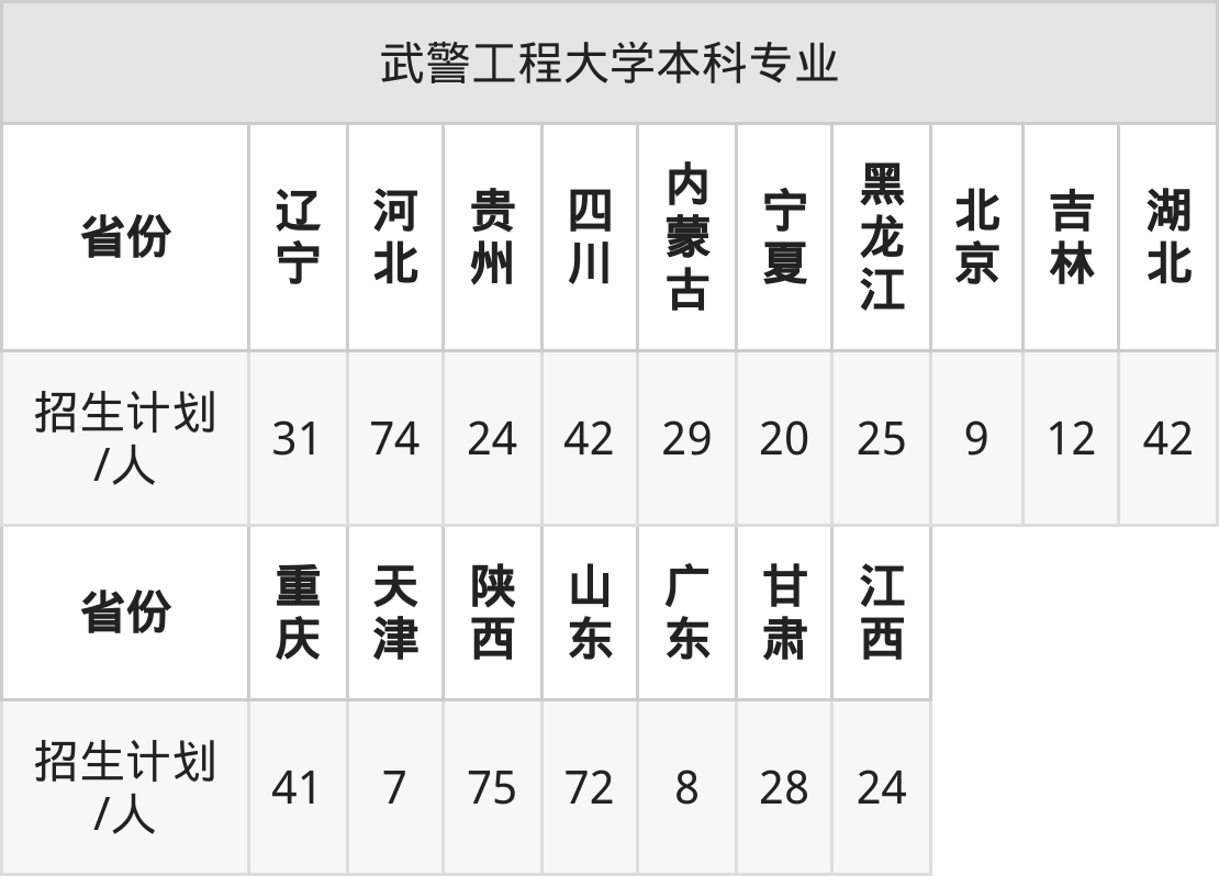 武警工程大学面向陕西(75人)、甘肃(28人)、北京(9人)、湖北(42人)、广东(8人)、内蒙古(29人)、吉林(12人)等17个地区开展本科招生。其中天津、重庆、贵州、内蒙古、吉林、河北、北京、甘肃招生批次为本科提前批A,其余省份为本科提前批。