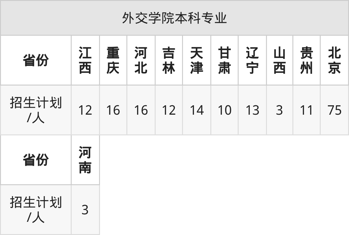 外交学院面向江西(12人)、天津(14人)、重庆(16人)、河北(16人)、贵州(11人)、北京(75人)、河南(3人)等11个地区开展本科招生。其中吉林招生批次为提前批A段,江西、辽宁招生批次为本科提前批,其余省份为本科提前批A。