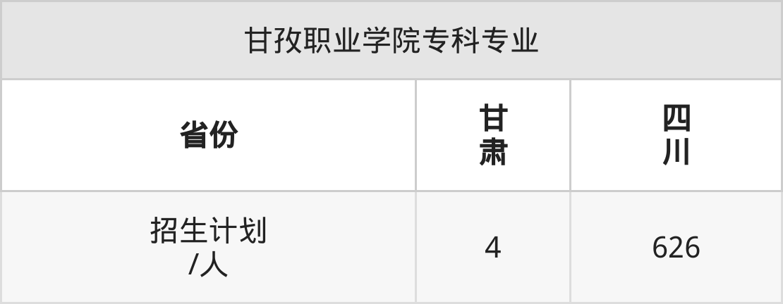 甘孜职业学院面向四川(626人)、甘肃(4人)开展专科招生。招生批次为专科批。