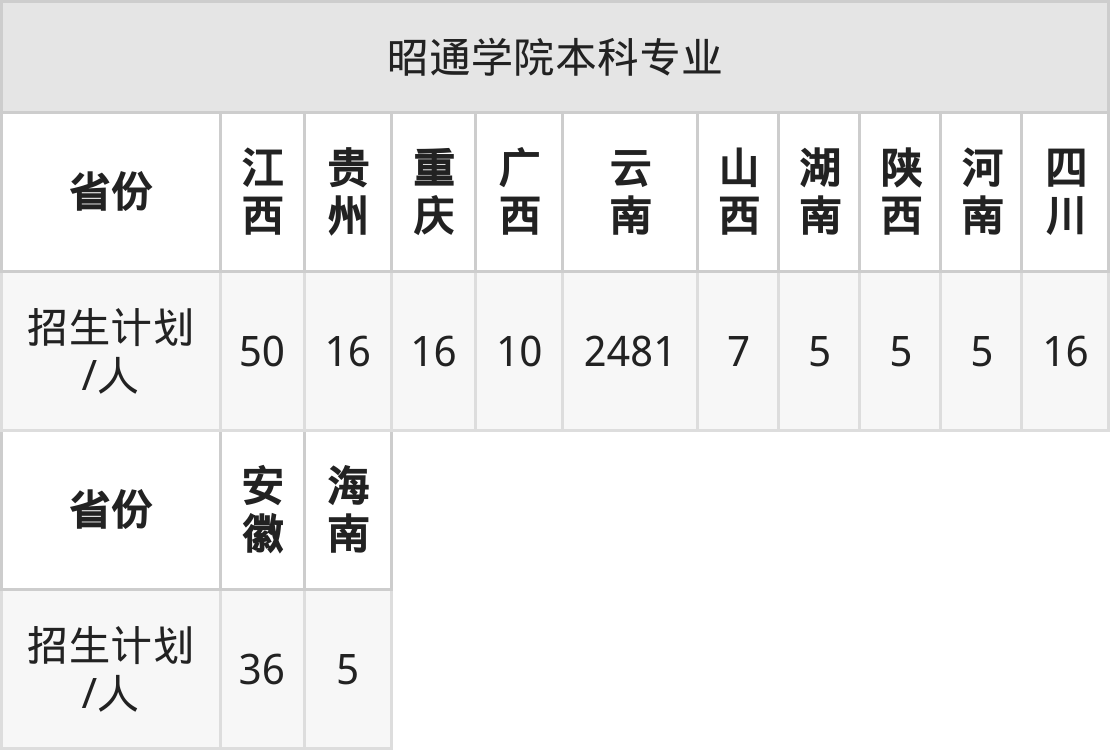 昭通学院面向江西(50人)、海南(5人)、广西(10人)、四川(16人)、陕西(5人)、河南(5人)、湖南(5人)等12个地区开展本科招生。其中云南招生批次为二本,四川、陕西、河南招生批次为本科二批,其余省份为本科批。