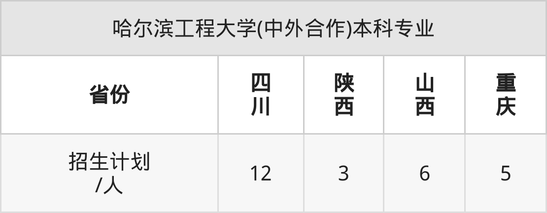 哈尔滨工程大学(中外合作)面向陕西(3人)、山西(6人)、重庆(5人)、四川(12人)开展本科招生。其中重庆招生批次为本科批,其余省份为本科一批。