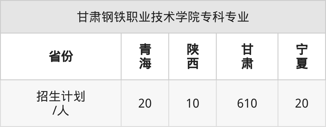 甘肃钢铁职业技术学院面向宁夏(20人)、青海(20人)、陕西(10人)、甘肃(610人)开展专科招生。招生批次为专科批。