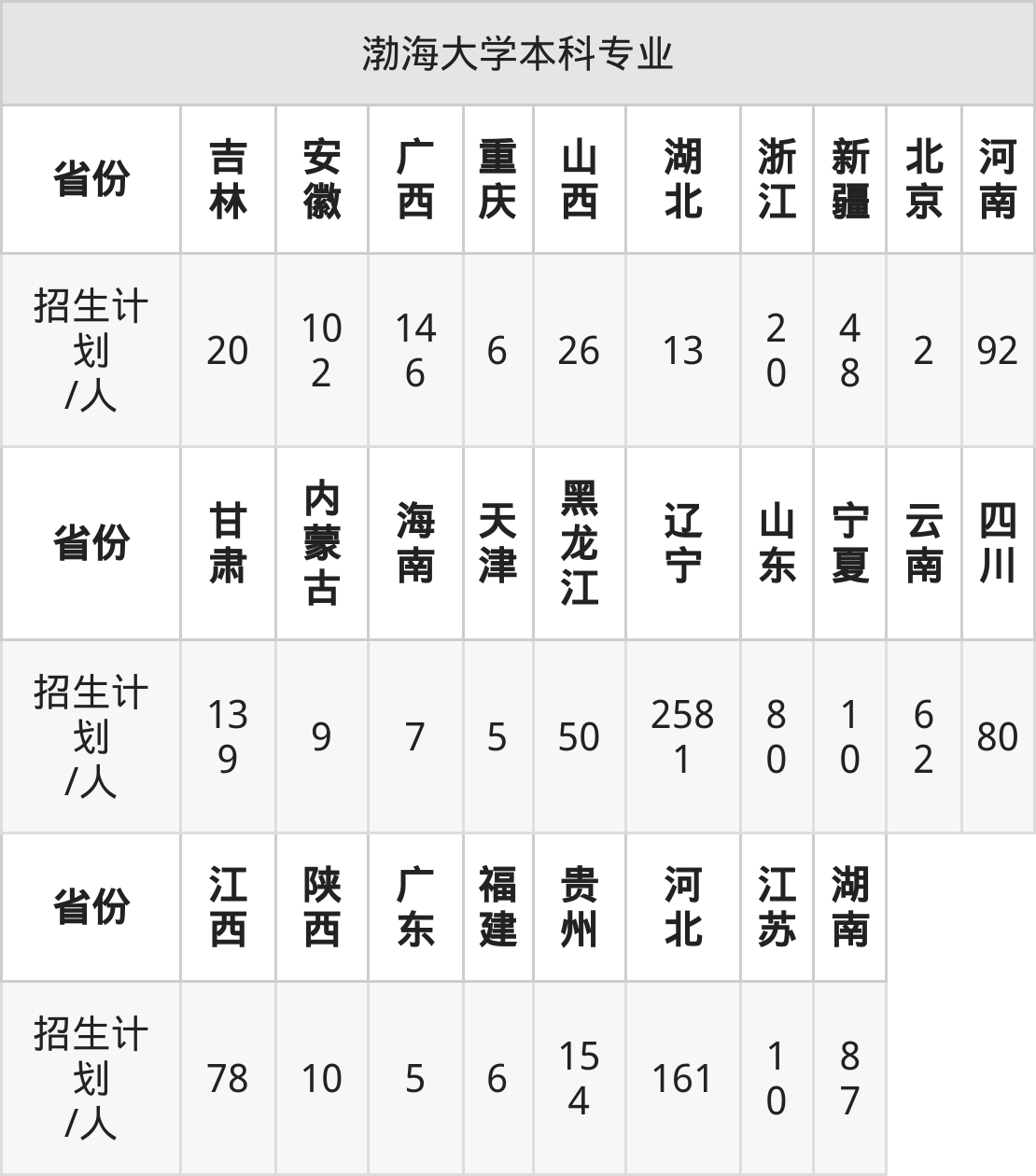 渤海大学面向广西(146人)、云南(62人)、江西(78人)、湖南(87人)、山西(26人)、安徽(102人)、宁夏(10人)等28个地区开展本科招生。其中内蒙古、新疆、陕西、四川、河南招生批次为本科二批,其余省份为本科批。