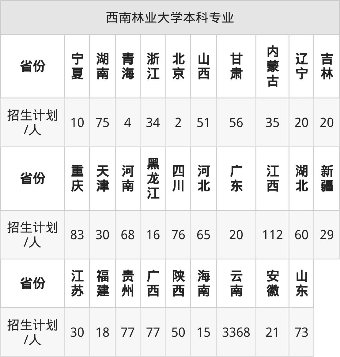 西南林业大学面向北京(2人)、辽宁(20人)、河北(65人)、福建(18人)、广西(77人)、河南(68人)、海南(15人)等29个地区开展本科招生。其中宁夏招生批次为第二批本科,陕西、新疆、内蒙古、河南、四川招生批次为本科二批,其余省份为本科批。