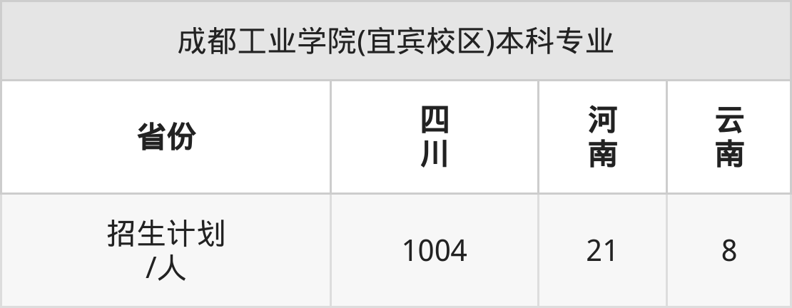 成都工业学院(宜宾校区)面向四川(1004人)、河南(21人)、云南(8人)开展本科招生。其中云南招生批次为二本,其余省份为本科二批。