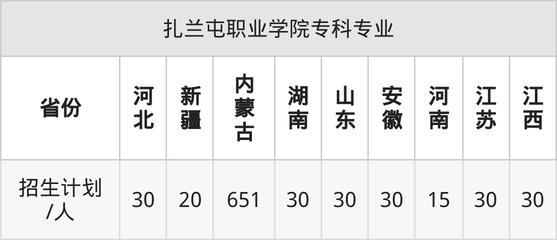 扎兰屯职业学院面向安徽(30人)、内蒙古(651人)、湖南(30人)、江西(30人)、山东(30人)、河北(30人)、新疆(20人)等9个地区开展专科招生。其中山东招生批次为二段,其余省份为专科批。