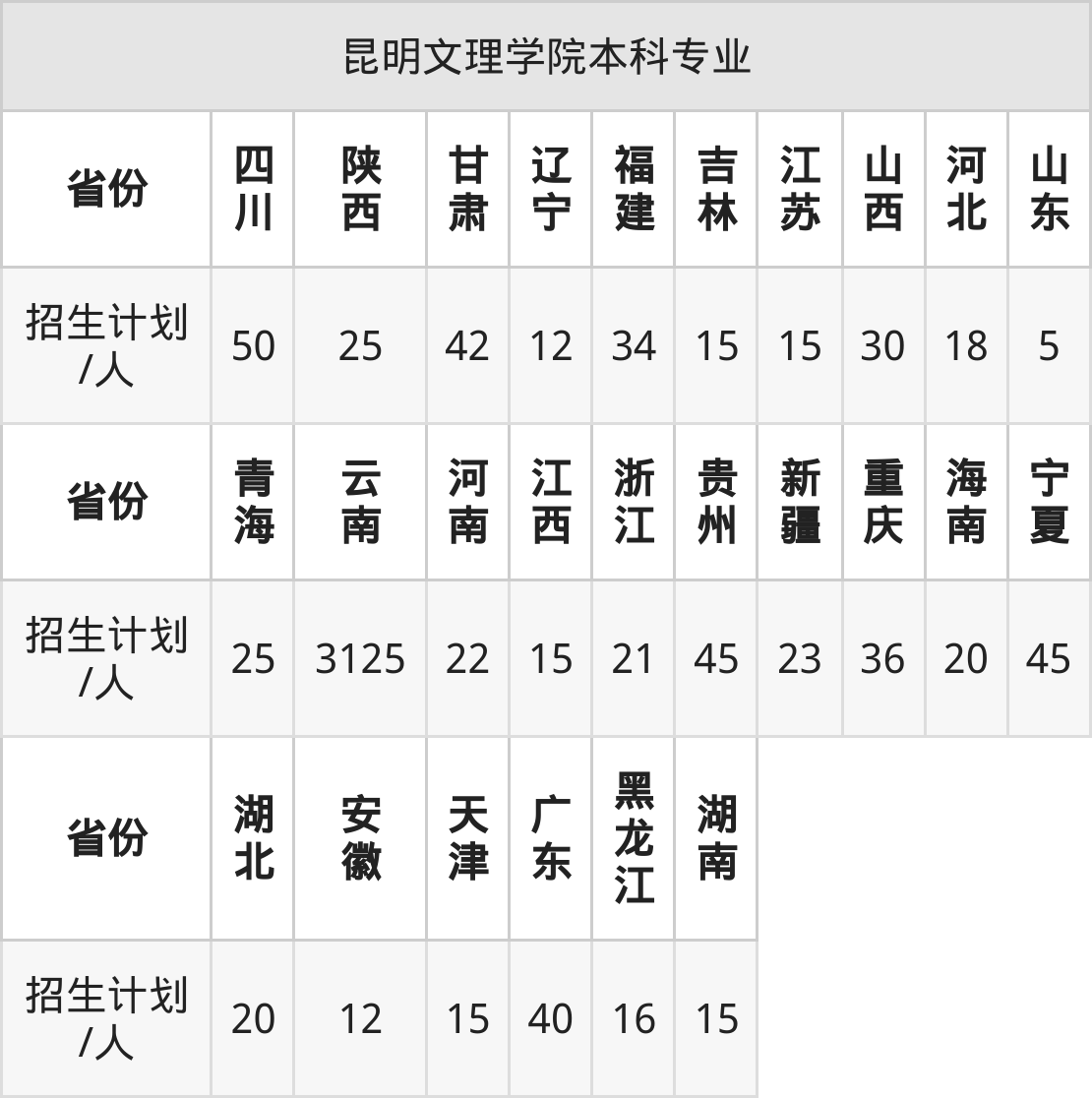昆明文理学院面向江西(15人)、福建(34人)、黑龙江(16人)、陕西(25人)、甘肃(42人)、吉林(15人)、湖北(20人)等26个地区开展本科招生。其中云南招生批次为二本,新疆、陕西、四川、河南招生批次为本科二批,其余省份为本科批。