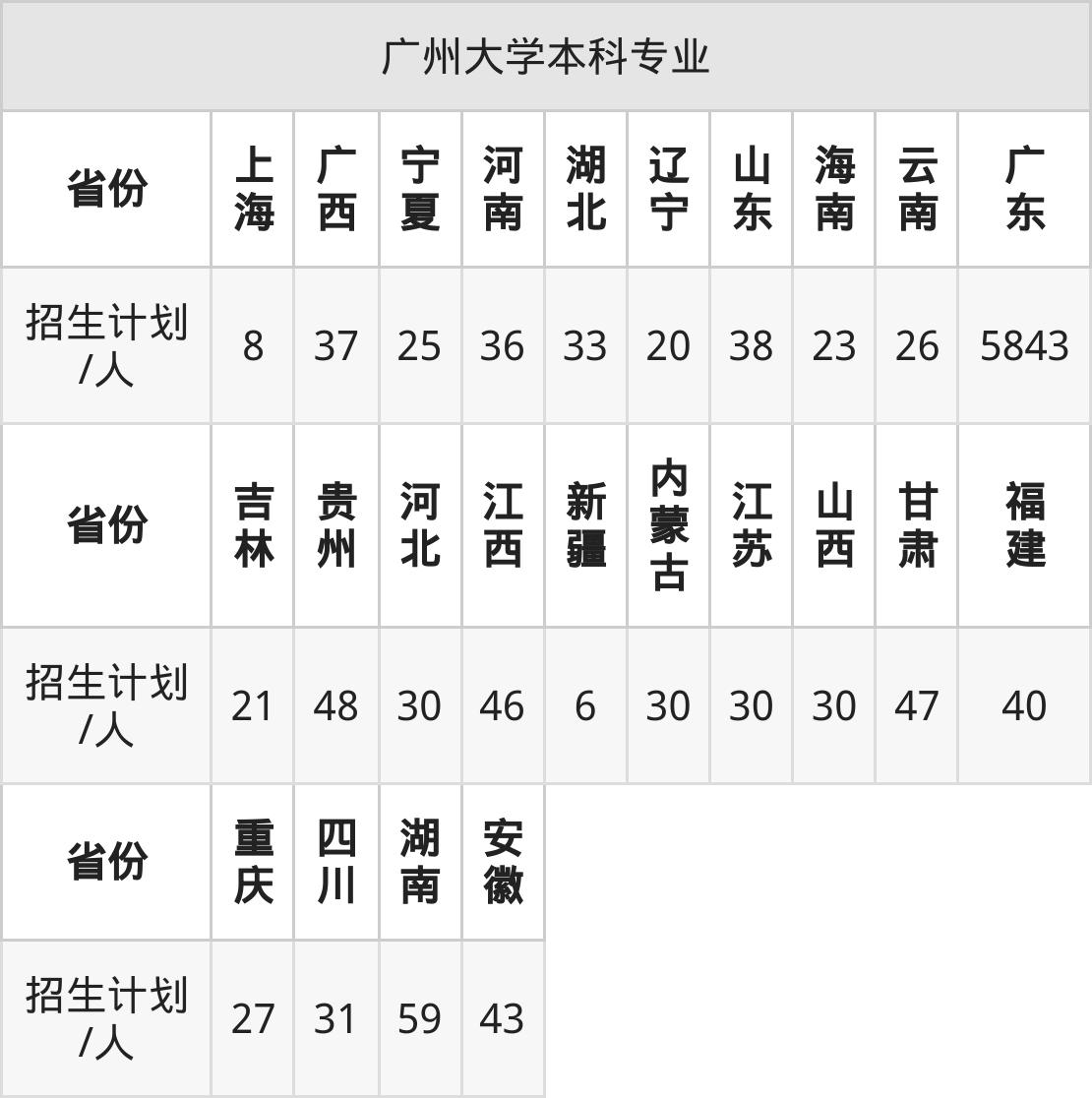 广州大学面向海南(23人)、福建(40人)、四川(31人)、广西(37人)、宁夏(25人)、新疆(6人)、上海(8人)等24个地区开展本科招生。其中宁夏招生批次为第一批本科,内蒙古、四川、新疆、河南招生批次为本科一批,其余省份为本科批。