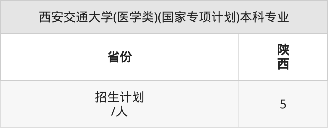 西安交通大学(医学类)(国家专项计划)面向陕西(5人)开展本科招生。招生批次为本科一批。