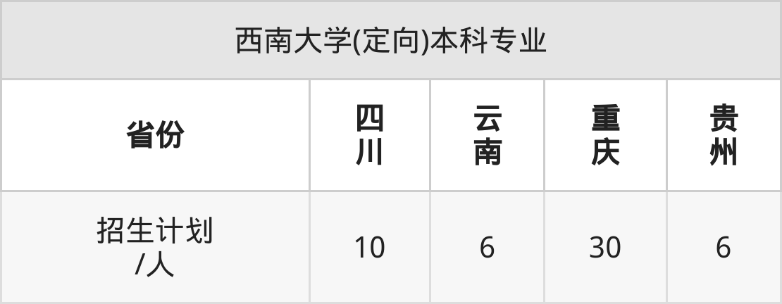 西南大学(定向)面向四川(10人)、云南(6人)、重庆(30人)、贵州(6人)开展本科招生。其中云南招生批次为一本,其余省份为本科批。