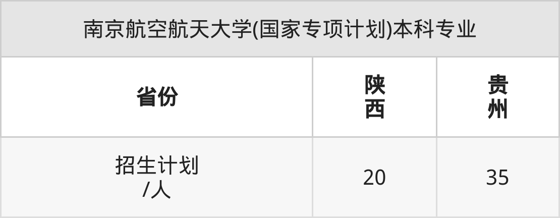 南京航空航天大学(国家专项计划)面向陕西(20人)、贵州(35人)开展本科招生。招生批次为本科批。
