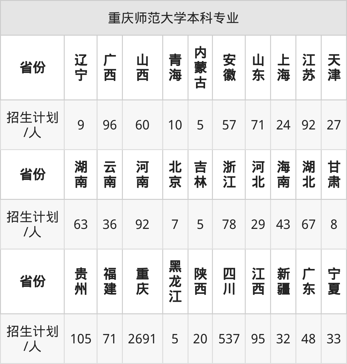 重庆师范大学面向浙江(78人)、内蒙古(5人)、辽宁(9人)、江西(95人)、河北(29人)、广东(48人)、四川(537人)等30个地区开展本科招生。其中天津招生批次为本科批A段,四川、新疆、内蒙古、陕西招生批次为本科二批,其余省份为本科批。