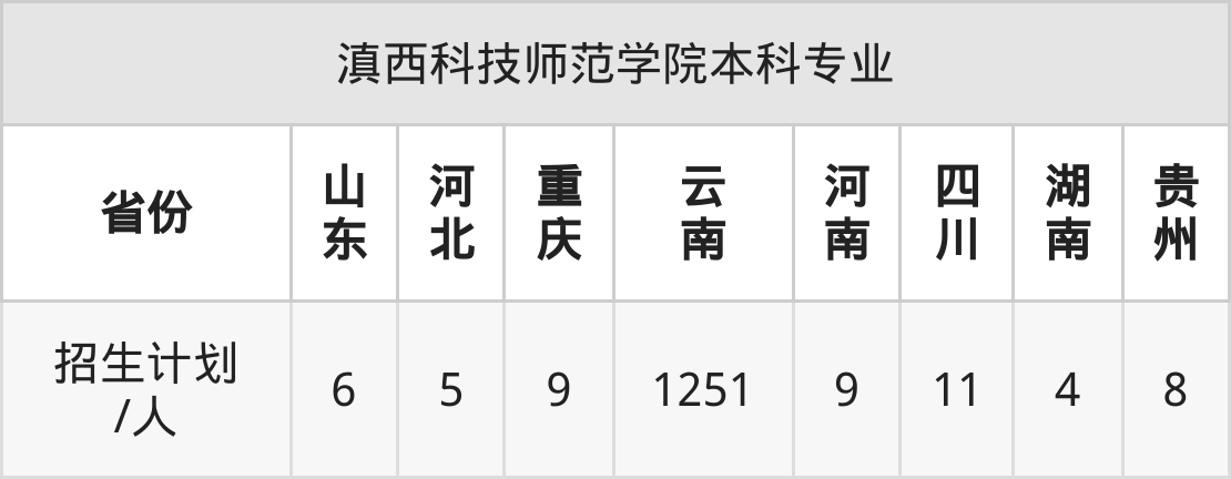 滇西科技师范学院面向四川(11人)、河南(9人)、云南(1251人)、山东(6人)、湖南(4人)、河北(5人)、重庆(9人)等8个地区开展本科招生。其中山东招生批次为一段,河南、四川招生批次为本科二批,其余省份为本科批。