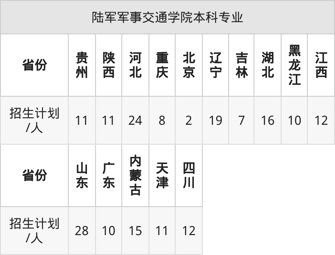 陆军军事交通学院面向北京(2人)、辽宁(19人)、内蒙古(15人)、吉林(7人)、湖北(16人)、河北(24人)、四川(12人)等15个地区开展本科招生。其中吉林、河北、重庆、天津、北京、贵州、内蒙古招生批次为本科提前批A,其余省份为本科提前批。