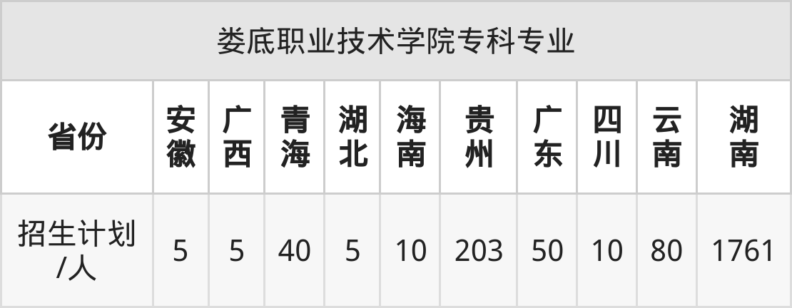 娄底职业技术学院面向湖北(5人)、海南(10人)、贵州(203人)、广东(50人)、云南(80人)、青海(40人)、湖南(1761人)等10个地区开展专科招生。招生批次为专科批。
