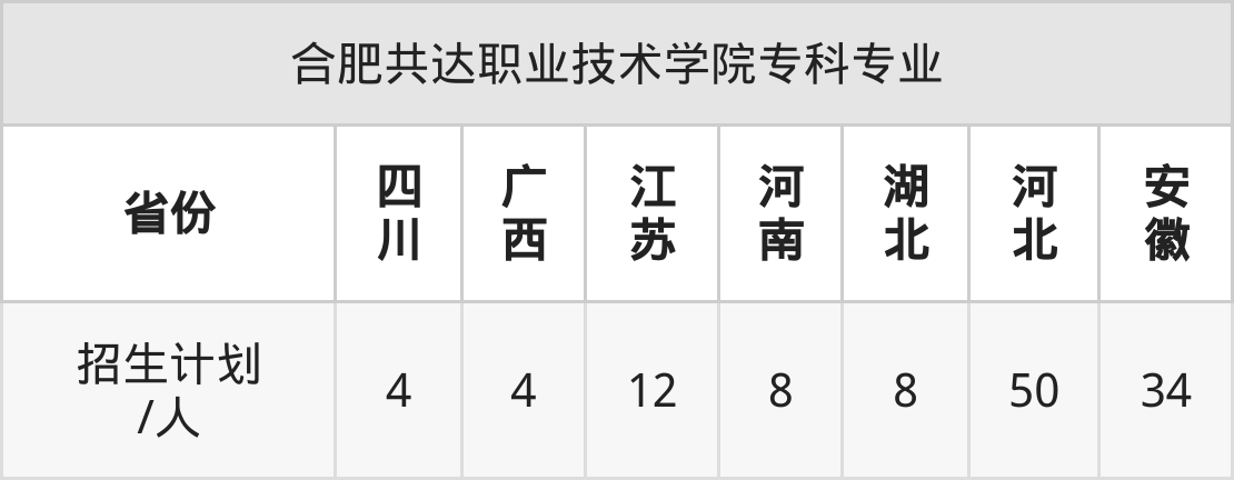 合肥共达职业技术学院面向河北(50人)、安徽(34人)、四川(4人)、广西(4人)、江苏(12人)、河南(8人)、湖北(8人)等7个地区开展专科招生。招生批次为专科批。