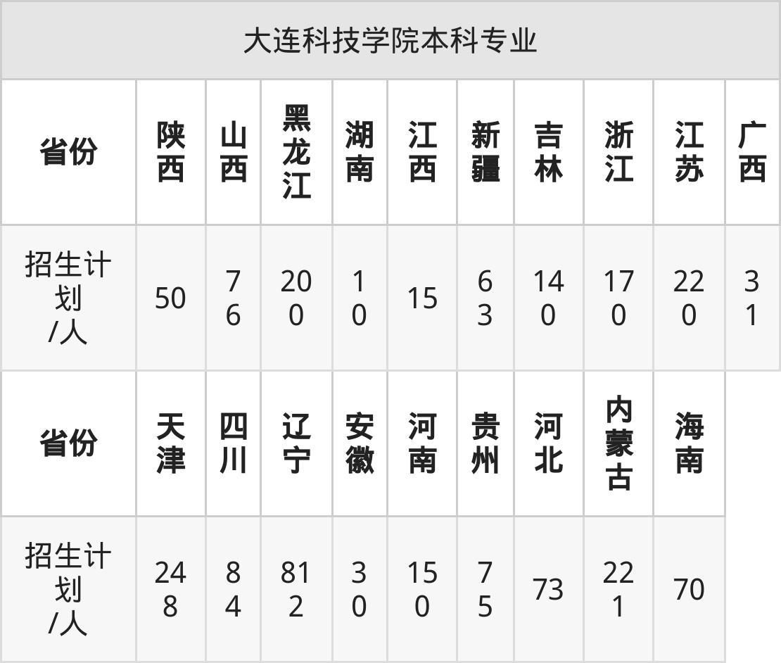 大连科技学院面向海南(70人)、山西(76人)、黑龙江(200人)、陕西(50人)、新疆(63人)、江西(15人)、吉林(140人)等19个地区开展本科招生。其中新疆、陕西、河南、内蒙古、四川招生批次为本科二批,其余省份为本科批。