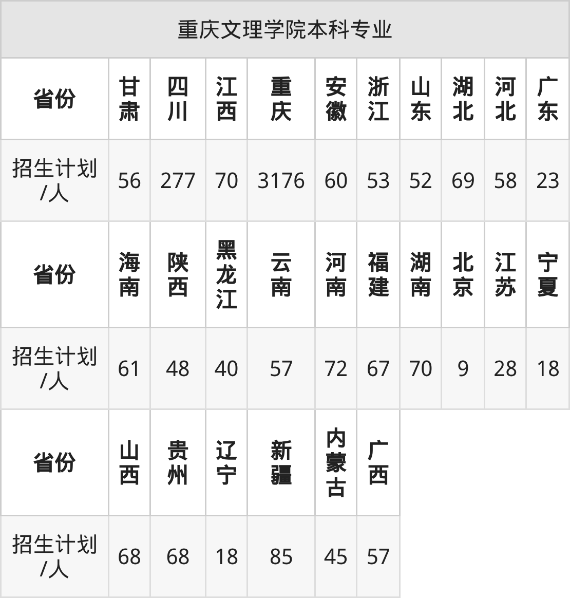 重庆文理学院面向北京(9人)、河南(72人)、河北(58人)、陕西(48人)、黑龙江(40人)、内蒙古(45人)、甘肃(56人)等26个地区开展本科招生。其中山东招生批次为一段,宁夏、云南、四川招生批次为本科批B段,其余省份为本科批。