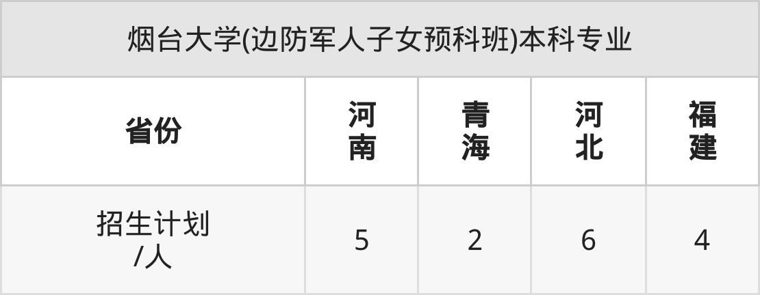 烟台大学(边防军人子女预科班)面向河南(5人)、青海(2人)、河北(6人)、福建(4人)开展本科招生。其中河南招生批次为本科二批,其余省份为本科批。