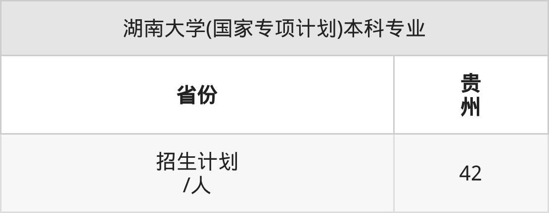 湖南大学(国家专项计划)面向贵州(42人)开展本科招生。招生批次为本科批。