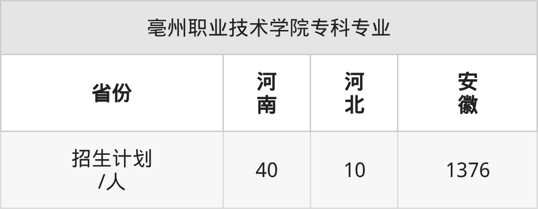 亳州职业技术学院面向河南(40人)、河北(10人)、安徽(1376人)开展专科招生。招生批次为专科批。