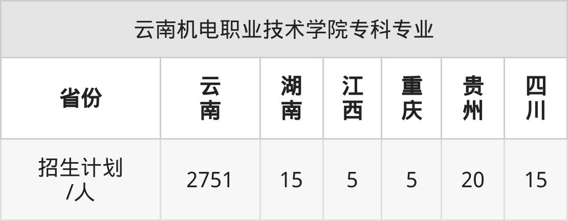 云南机电职业技术学院面向湖南(15人)、江西(5人)、重庆(5人)、贵州(20人)、四川(15人)、云南(2751人)开展专科招生。招生批次为专科批。