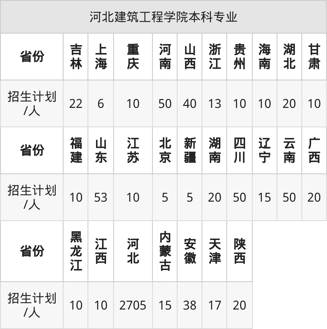 河北建筑工程学院面向天津(17人)、广西(20人)、贵州(10人)、安徽(38人)、云南(50人)、湖南(20人)、海南(10人)等27个地区开展本科招生。其中山东招生批次为一段,新疆、四川、河南、内蒙古、陕西招生批次为本科二批,其余省份为本科批。