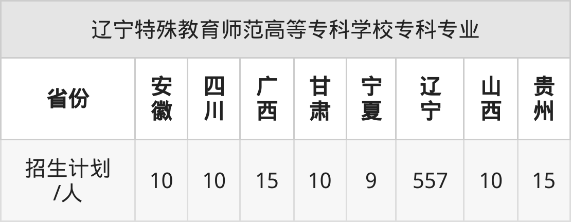 辽宁特殊教育师范高等专科学校面向贵州(15人)、安徽(10人)、四川(10人)、广西(15人)、甘肃(10人)、宁夏(9人)、辽宁(557人)等8个地区开展专科招生。招生批次为专科批。