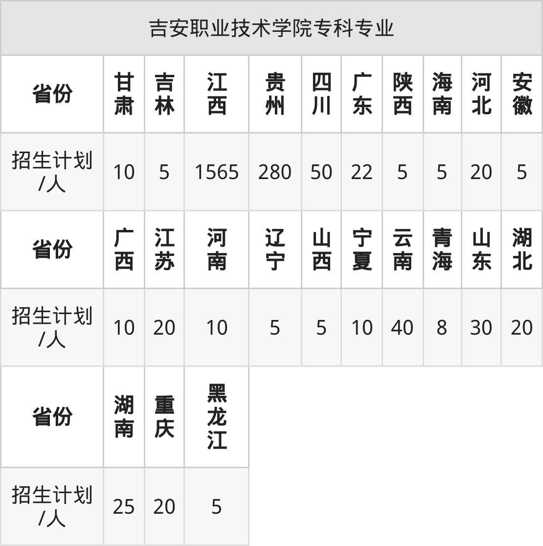 吉安职业技术学院面向湖南(25人)、宁夏(10人)、广西(10人)、江苏(20人)、河南(10人)、辽宁(5人)、湖北(20人)等23个地区开展专科招生。其中山东招生批次为二段,其余省份为专科批。