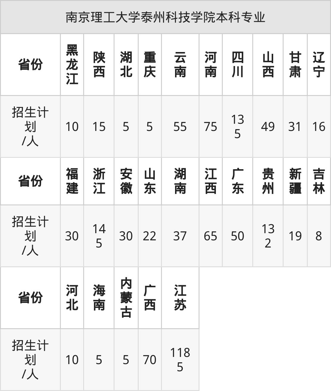 南京理工大学泰州科技学院面向安徽(30人)、浙江(145人)、广西(70人)、甘肃(31人)、云南(55人)、山西(49人)、福建(30人)等25个地区开展本科招生。其中山东招生批次为一段,河南、四川、内蒙古、新疆、陕西招生批次为本科二批,其余省份为本科批。