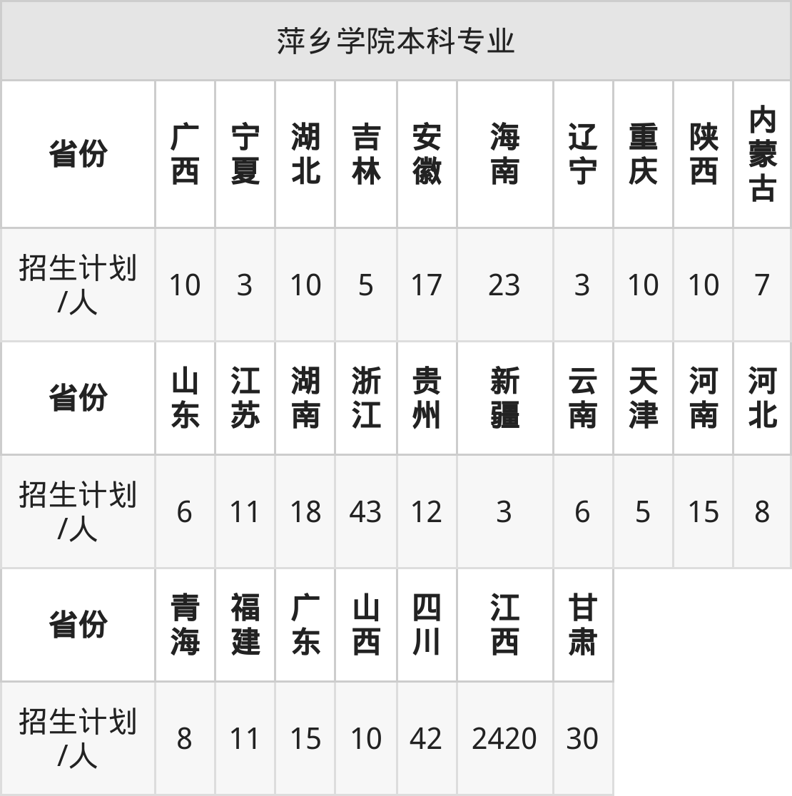 萍乡学院面向河北(8人)、四川(42人)、陕西(10人)、甘肃(30人)、贵州(12人)、广东(15人)、内蒙古(7人)等27个地区开展本科招生。其中新疆、内蒙古、河南、陕西、四川招生批次为本科二批,其余省份为本科批。