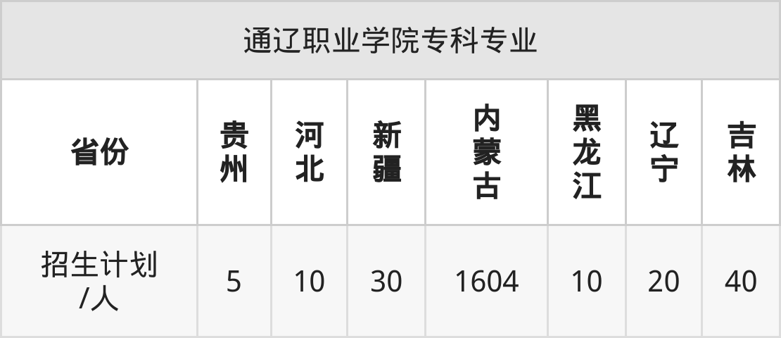 通辽职业学院面向黑龙江(10人)、辽宁(20人)、吉林(40人)、贵州(5人)、河北(10人)、新疆(30人)、内蒙古(1604人)等7个地区开展专科招生。招生批次为专科批。