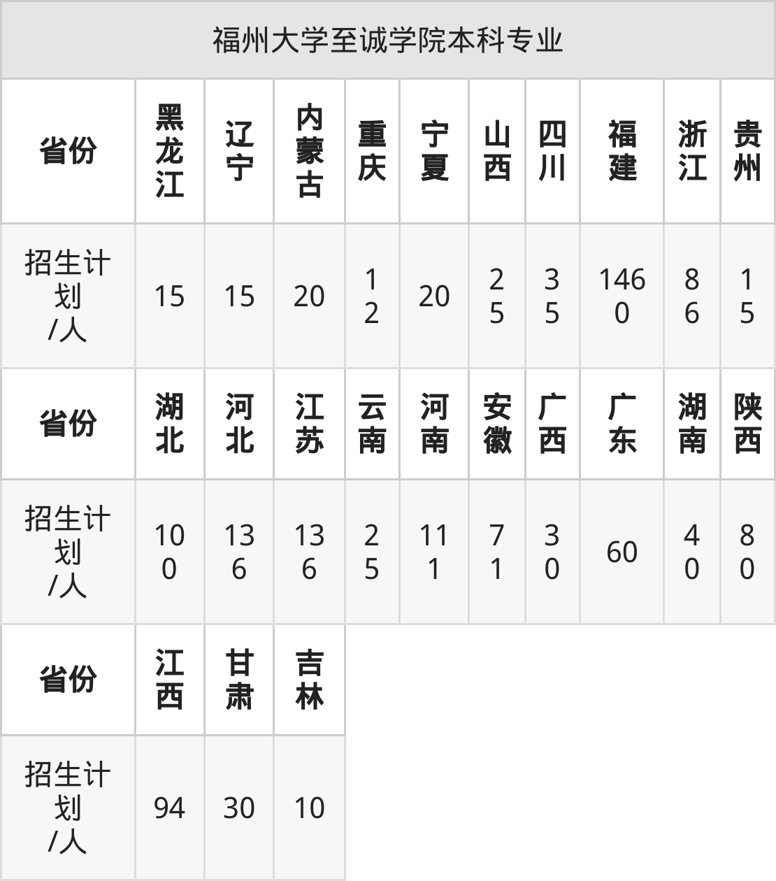 福州大学至诚学院面向陕西(80人)、河南(111人)、湖南(40人)、江西(94人)、湖北(100人)、安徽(71人)、广东(60人)等23个地区开展本科招生。其中云南招生批次为二本,河南、陕西、四川、内蒙古招生批次为本科二批,其余省份为本科批。