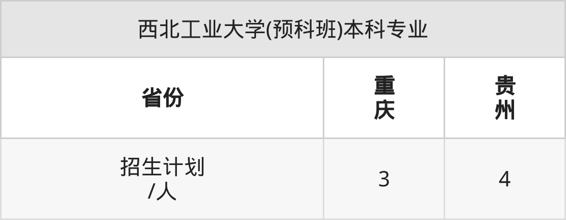 西北工业大学(预科班)面向重庆(3人)、贵州(4人)开展本科招生。招生批次为本科批。