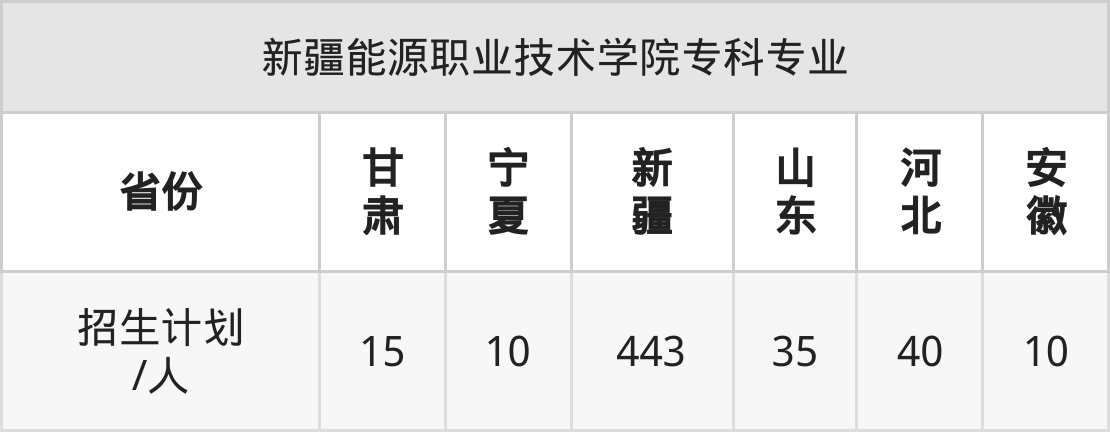 新疆能源职业技术学院面向河北(40人)、安徽(10人)、甘肃(15人)、宁夏(10人)、新疆(443人)、山东(35人)开展专科招生。其中山东招生批次为二段,其余省份为专科批。