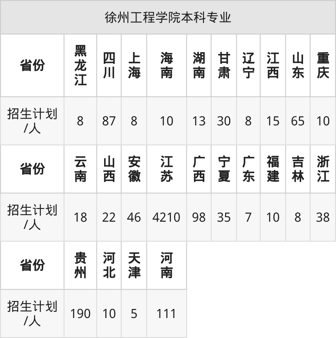 徐州工程学院面向重庆(10人)、天津(5人)、浙江(38人)、河南(111人)、吉林(8人)、河北(10人)、广东(7人)等24个地区开展本科招生。其中河南、四川招生批次为本科二批,其余省份为本科批。
