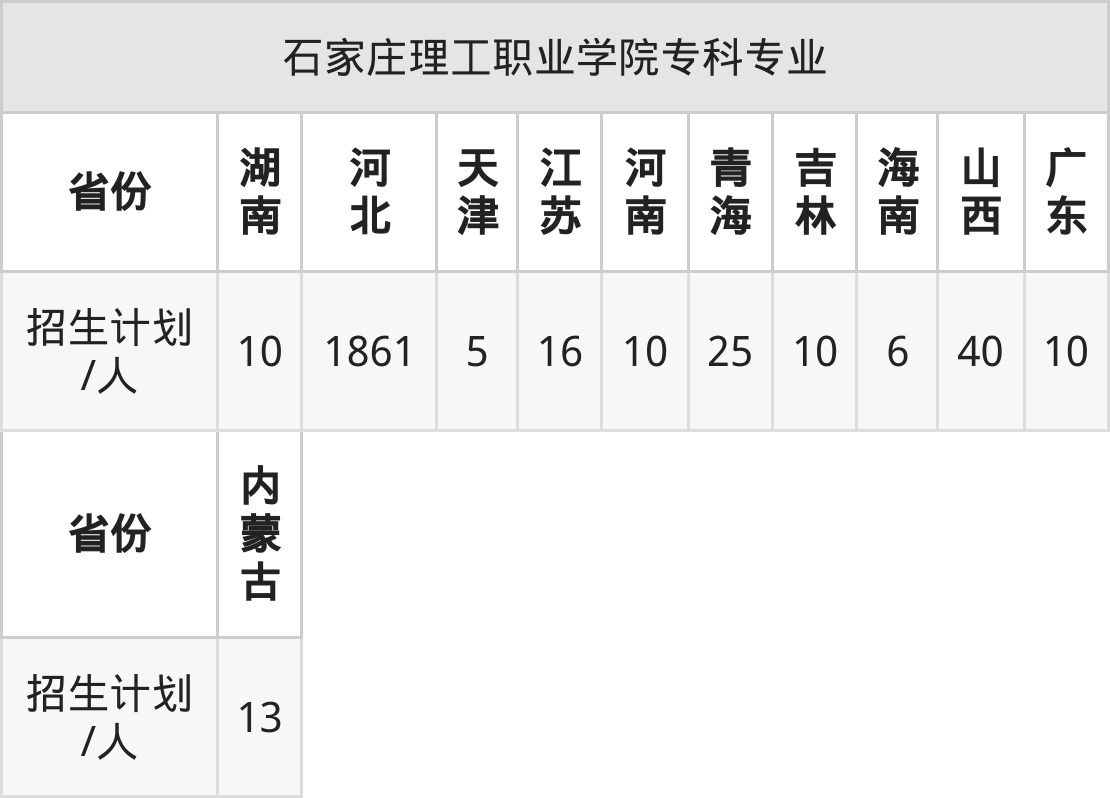 石家庄理工职业学院面向海南(6人)、内蒙古(13人)、河南(10人)、天津(5人)、广东(10人)、江苏(16人)、青海(25人)等11个地区开展专科招生。招生批次为专科批。