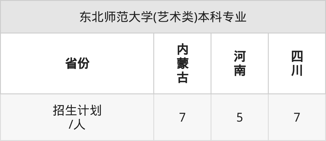 东北师范大学(艺术类)面向内蒙古(7人)、河南(5人)、四川(7人)开展本科招生。招生批次为本科一批。