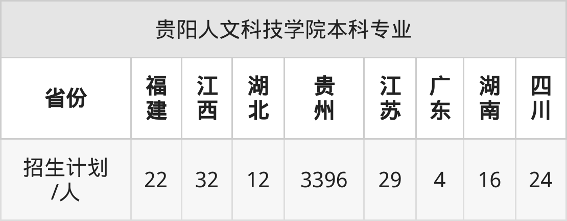 贵阳人文科技学院面向江苏(29人)、江西(32人)、湖北(12人)、湖南(16人)、贵州(3396人)、福建(22人)、广东(4人)等8个地区开展本科招生。其中四川招生批次为本科二批,其余省份为本科批。