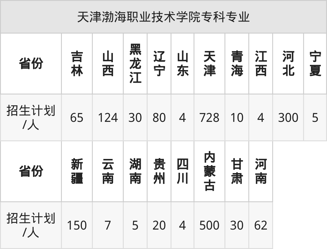 天津渤海职业技术学院面向湖南(5人)、黑龙江(30人)、甘肃(30人)、辽宁(80人)、青海(10人)、河北(300人)、山西(124人)等18个地区开展专科招生。其中山东招生批次为二段,其余省份为专科批。