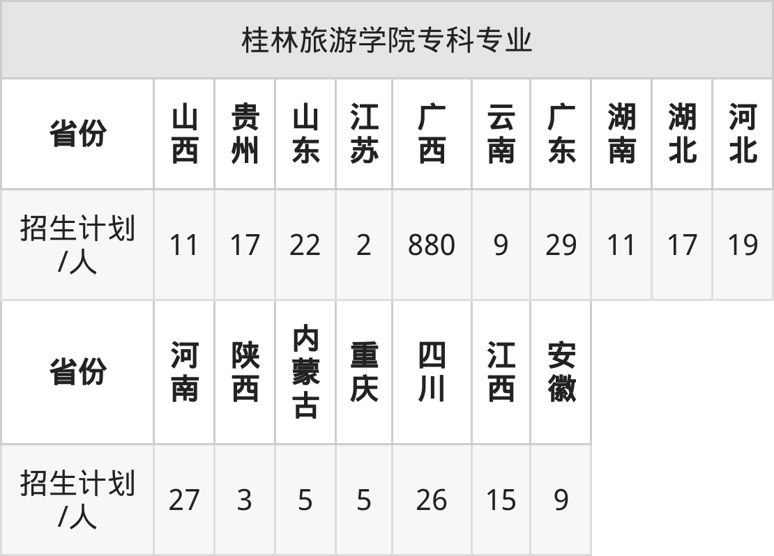 桂林旅游学院面向陕西(19人)、宁夏(10人)、内蒙古(10人)、山东(53人)、安徽(15人)、青海(6人)、福建(18人)等27个地区开展本科招生。其中山西招生批次为第二批本科A类,陕西、新疆、河南、四川、内蒙古招生批次为本科二批,其余省份为本科批。