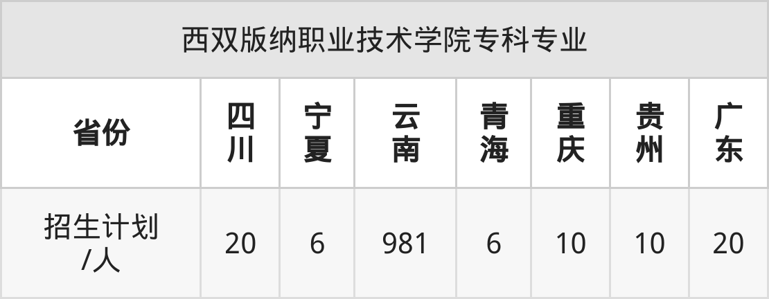 西双版纳职业技术学院面向广东(20人)、四川(20人)、宁夏(6人)、云南(981人)、青海(6人)、重庆(10人)、贵州(10人)等7个地区开展专科招生。招生批次为专科批。