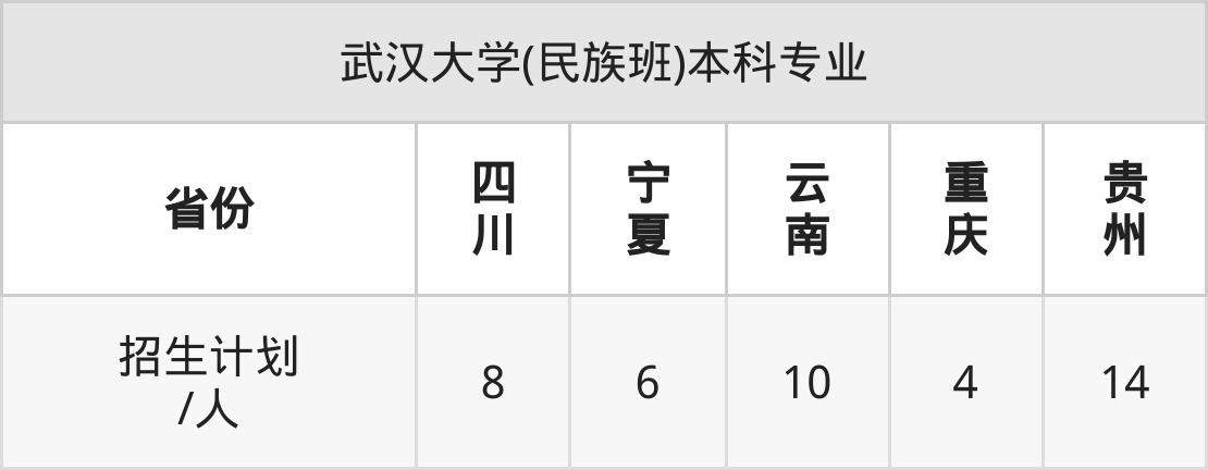 武汉大学(民族班)面向贵州(14人)、四川(8人)、宁夏(6人)、云南(10人)、重庆(4人)开展本科招生。其中云南招生批次为一本,其余省份为本科批。