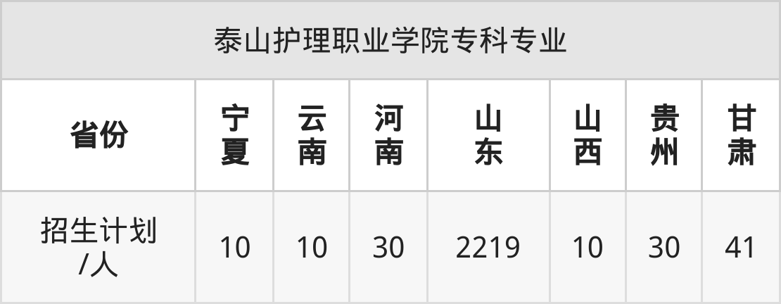 泰山护理职业学院面向甘肃(41人)、宁夏(10人)、云南(10人)、河南(30人)、山东(2219人)、山西(10人)、贵州(30人)等7个地区开展专科招生。其中山东招生批次为二段,其余省份为专科批。