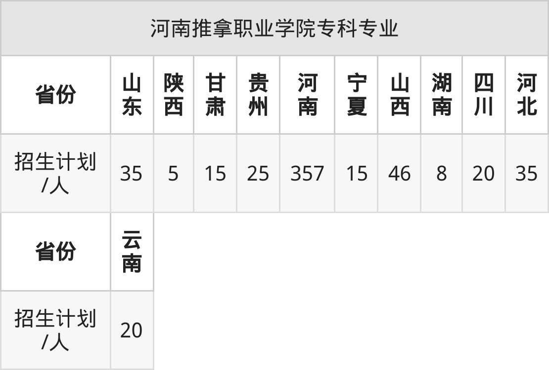 河南推拿职业学院面向四川(20人)、陕西(5人)、甘肃(15人)、云南(20人)、湖南(8人)、河北(35人)、山西(46人)等11个地区开展专科招生。其中山东招生批次为二段,其余省份为专科批。